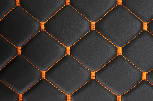 Black Orange Quilted Vinyl Faux Leather Car Upholstery Fabric | 2"x2" 5x5cm Diamond Stitch with 5mm Foam | 140cm Wide | Automotive