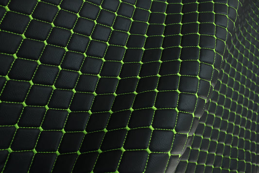 Black Light Green Quilted Vinyl Faux Leather Car Upholstery Fabric | 2"x2" 5x5cm Diamond Stitch with 5mm Foam | 140cm Wide | Automotive