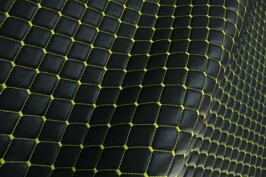 Black Yellow Quilted Vinyl Faux Leather Car Upholstery Fabric | 2"x2" 5x5cm Diamond Stitch with 5mm Foam | 140cm Wide | Automotive