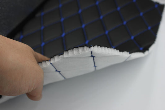 Blue Quilted Black Vinyl Faux Leather Car Upholstery Fabric | 2" x 5cm Pattern Line Stitch with 5mm Foam Backing | 140cm Wide | Automotive