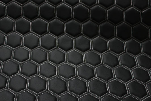 White Quilted Hexagon Black Vinyl Faux Leather Car Upholstery Fabric | 2" x 5cm Pattern Line Stitch with 5mm Foam Backing | 140cm Wide | Automotive