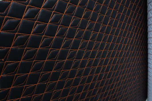 Orange Quilted Black Vinyl Faux Leather Car Upholstery Fabric | 2" x 5cm Hexagon Pattern Stitch with 5mm Foam Backing | 140cm Wide | Automotive