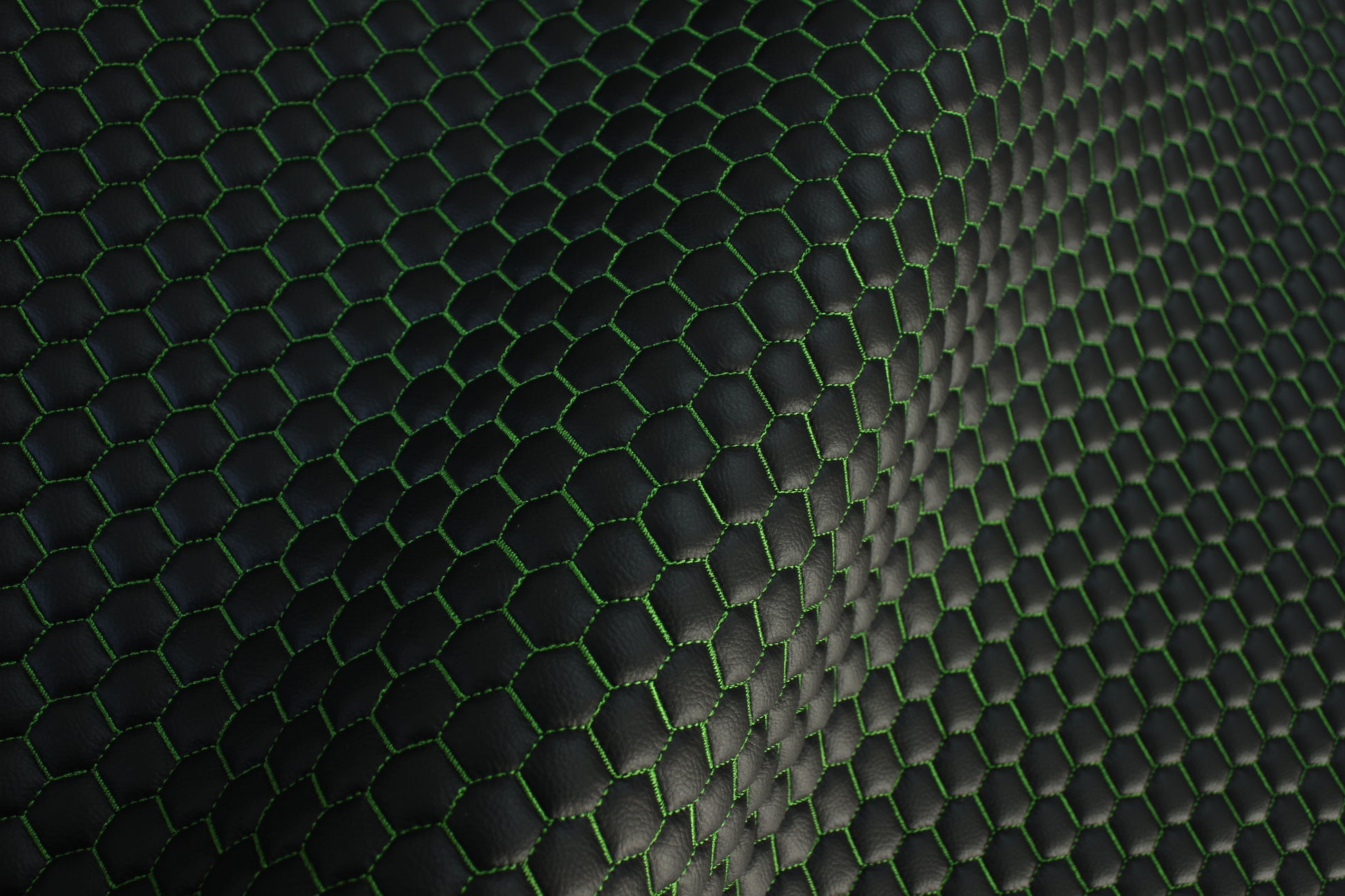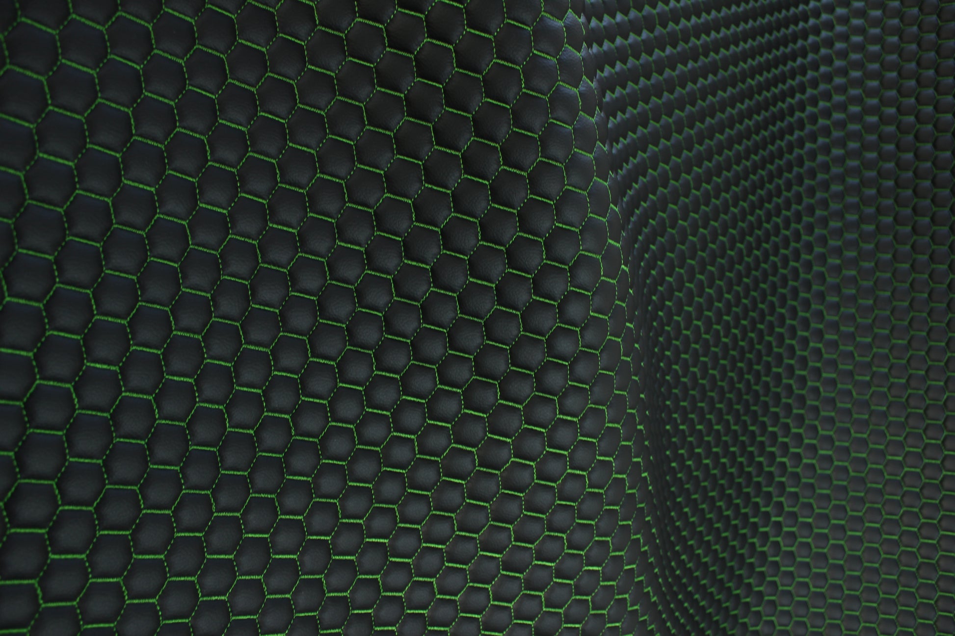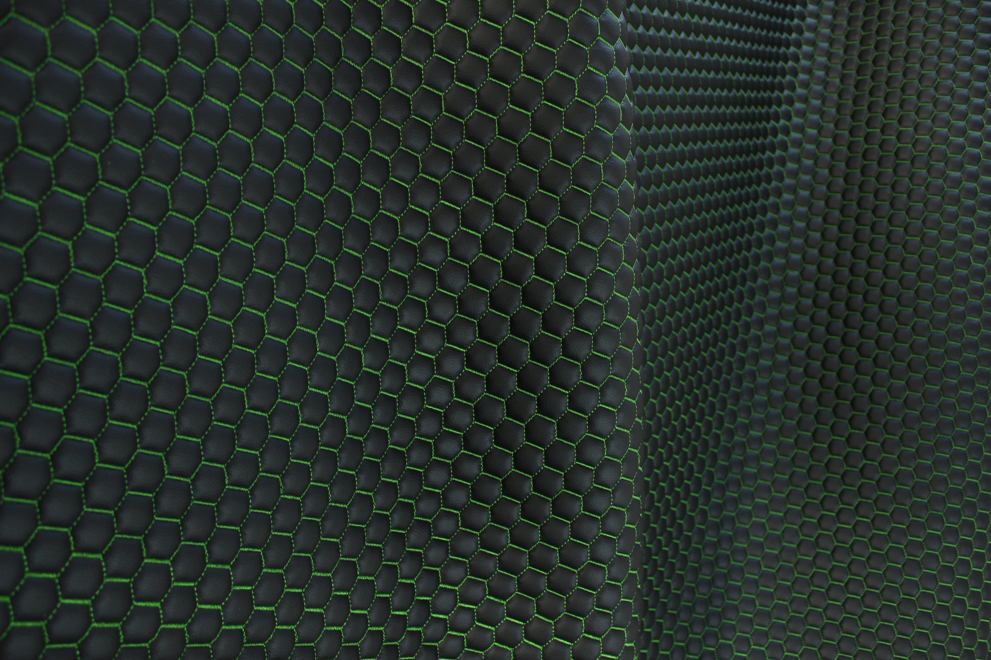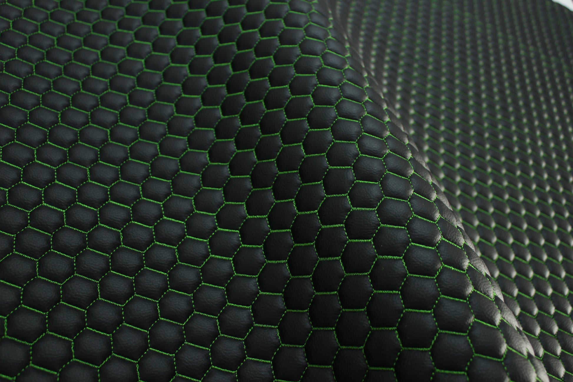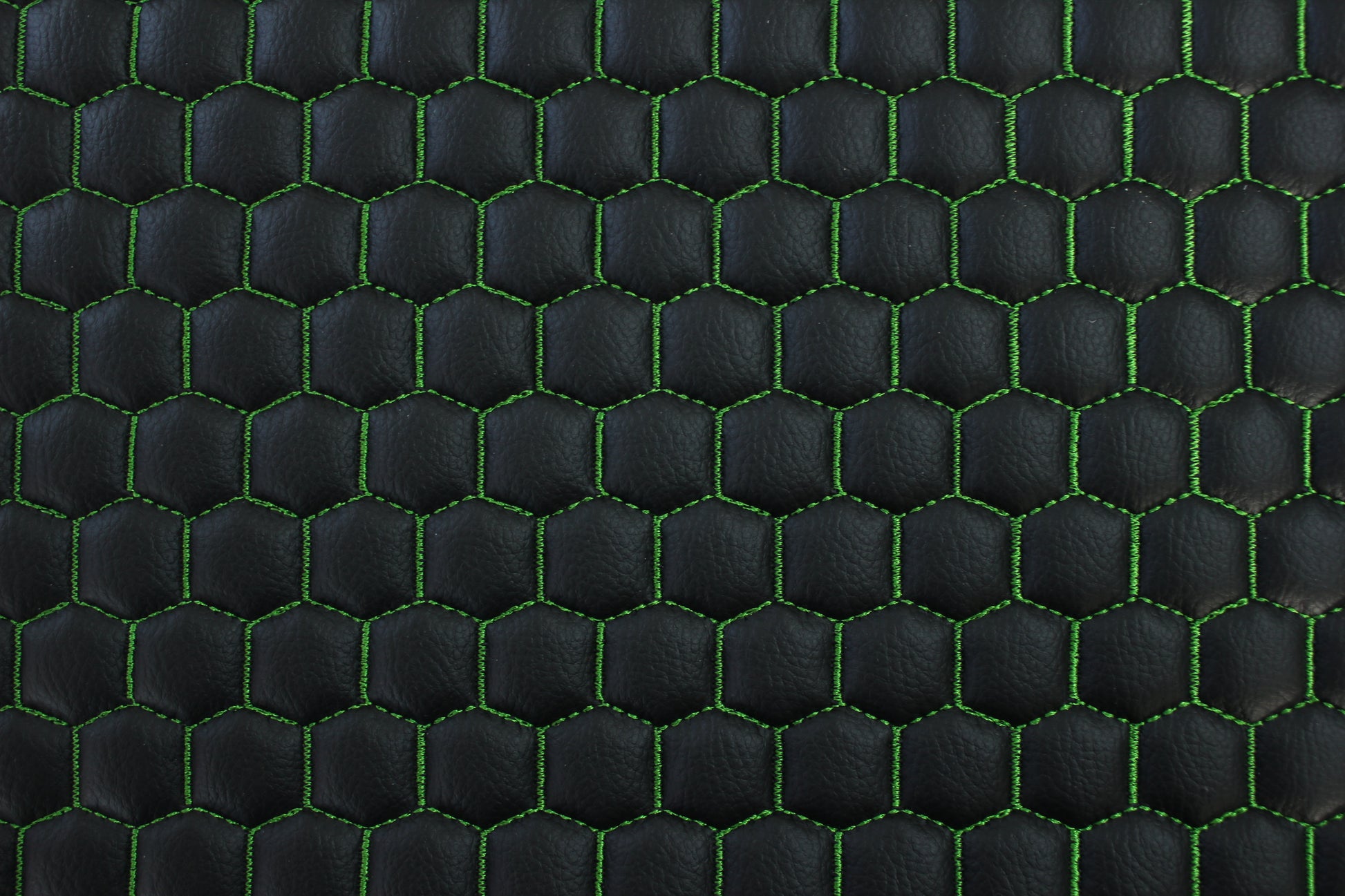 Green Quilted Black Vinyl Faux Leather Car Upholstery Fabric | 2" x 5cm Honeycomb Pattern Stitch with 5mm Foam Backing | 140cm Wide | Automotive